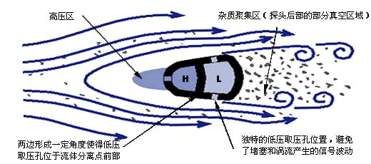 探頭的前部形成高壓區,壓力(lì)略高於管道靜壓,阻止了顆粒進入。請注意(yì):在探頭的高壓取壓孔處流體的速度是零,沒有物體會進入取壓孔。