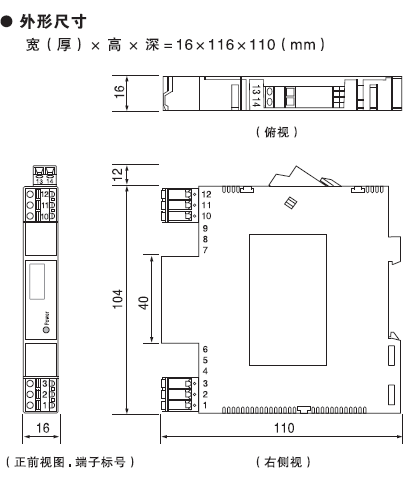 6、結構及外形尺寸: 結構:卡裝式模塊化表芯ABS材質機殼拔插式端子 外(wài)形尺寸(cùn):W16×H116×D110(mm),整機重量(liàng):約110g