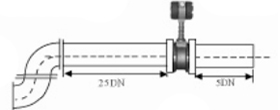 | 5.不同平麵兩個彎管的安裝 如果流(liú)量計的前端有兩個90°彎頭,要保證流量計(jì)的前(qián)直管段≥25D,後直管段(duàn)≥5D | | |||||||||||